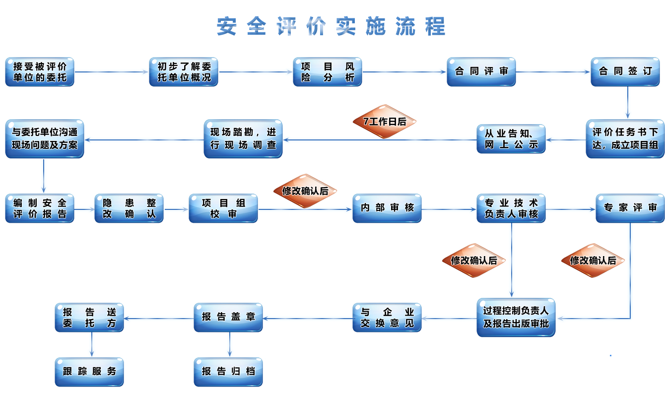 我公司與被評價單位簽訂安全評價委托書后,7個工作日內進行現場初步調查,現場調查人出具書面的初步調查報告和項目風險分析(主要反映企業的書面資料的合法性和真實性以及現場存在的主要問題)。并與被評價單位溝通協商,決定是否接受安全評價委托及進行合同評審程序。
